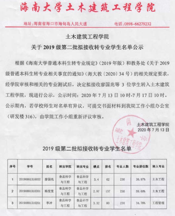 yl6809永利集团关于2019级第二批拟接收转专业学生名单公示