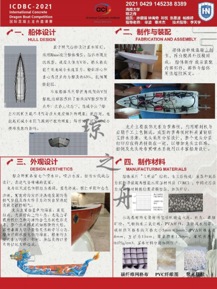 2021年6月14日,在中国高等教育学会工程教育专业委员会、高等学校土木工程学科专业指导委员会指导下,由国际混凝土龙舟技术委员会组织,获得美国混凝土协会(ACI)授权协办的第三届国际大学生混凝土龙舟竞赛(ICDBC2021)在浙江大学国际校区(浙江海宁)开赛。来自包括浙江大学、天津大学和yl6809永利检测中心等多所高校的40支队伍,在端午佳节进行了激烈的竞争和角逐,由我院的单波和秦术杰两位老师带领的“琼之舟”队荣获二等奖和优秀设计奖,参赛学生包括孙康瑞、钟禹奇、张恩波、杨雅婷和祁悦。