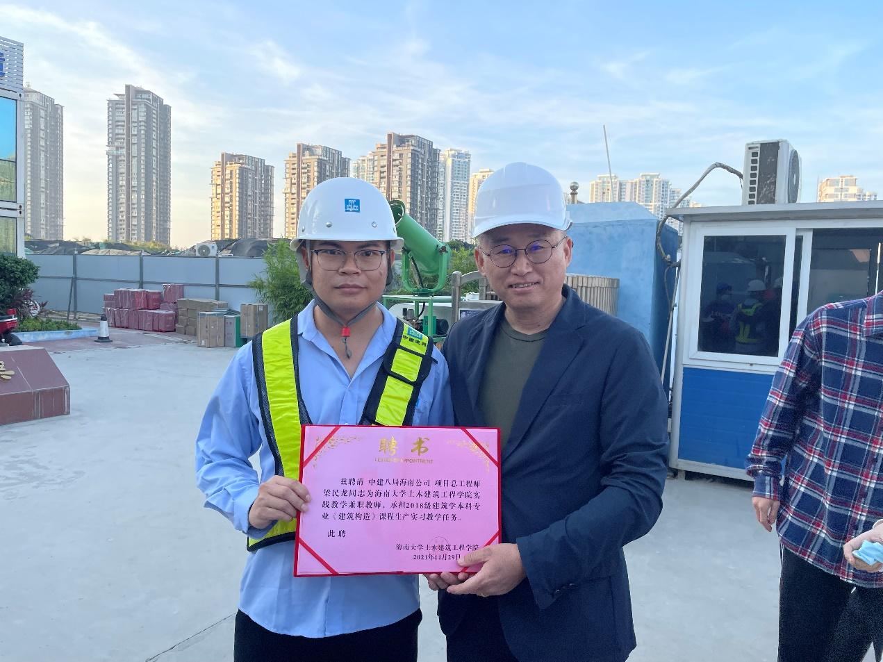 华彩·海口湾广场项目参观开始前,中国建筑第八工程局有限公司的海南公司梁民龙作为项目总工程师,针对项目的玻璃幕墙工程在会议室给学生们做了精彩的报告,详细地介绍了玻璃幕墙的结构组成、特点分析、材料加工工艺、转角部位安装难点等内容。报告结束后,老师和项目施工现场负责人带领学生到施工现场实地参观。参观过程中,以老师讲解学生提问的方式,把实际工程和课本上的理论知识相结合,加深了学生对玻璃幕墙的认知和理解。参观结束后,陶锋老师给工程师梁民龙颁发聘书,聘请中建八局海南公司项目总工程师梁民龙同志为yl6809永利集团实践教学兼职教师,承担2018级建筑学本科专业《建筑构造》课程生产实习教学任务。