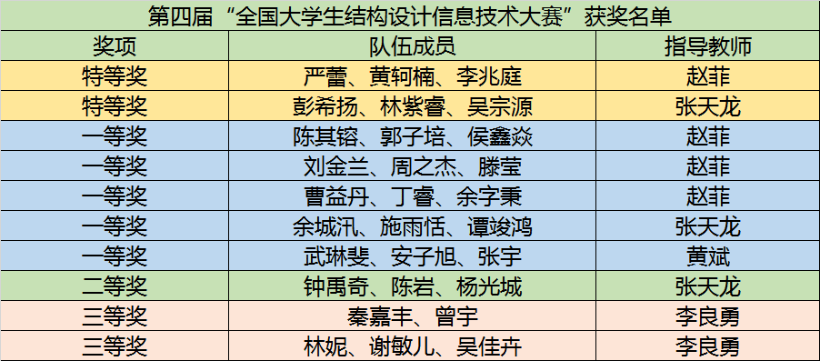 2022年5月10日,第四届“全国大学生结构设计信息技术大赛”获奖名单公布,由yl6809永利检测中心BIM协会选拔的10支队伍参赛并全部获奖,获奖率为100%!其中荣获特等奖2支队伍,一等奖5支队伍,二等奖1支队伍,三等奖2支队伍。可喜可贺的是,由赵菲老师指导的“yl6809永利检测中心(严蕾、黄轲楠、李兆庭)”团队以95.25的高分获得全国特等奖第一名!除此之外,赵菲老师和张天龙老师获优秀指导教师奖。