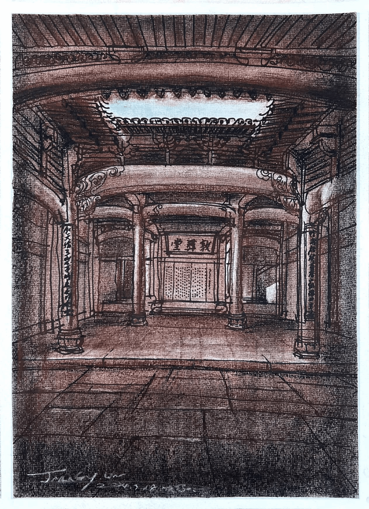蒋伊琳老师在进士第前示范了记录建筑内部结构的速写方法和对建筑主体及配景主次区分的表达技法,并在傍晚评图时对建筑水彩表达的几个层次进行讲解。