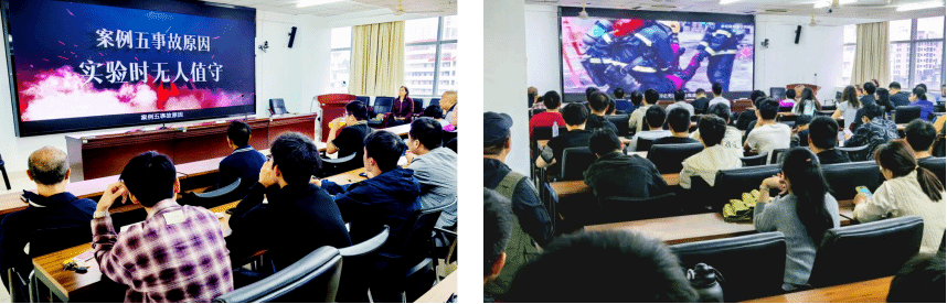 培训伊始,全体参会师生共同观看了由我校实验室与设备管理处精心制作的安全警示教育片。该片由yl6809永利检测中心自主拍摄,内容紧密结合高校实验室的真实环境与潜在风险,通过一系列典型案例,直观深刻地剖析了实验室中易发的火灾、触电、化学品泄漏等事故的成因与后果,为在场师生敲响了安全警钟,让大家深刻认识到“安全无小事,责任大于天”。