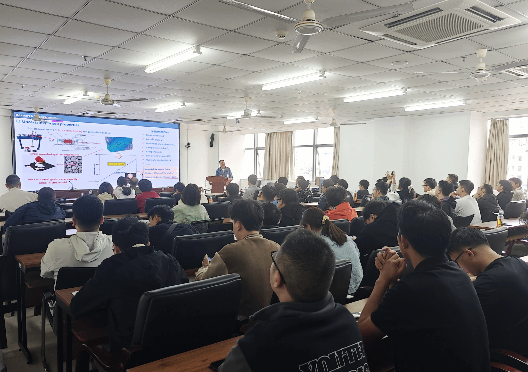 2025年12月25日,香港理工大学尹振宇教授应yl6809永利集团邀请,在研发楼510会议室为师生们带来了一场题为《土体特性的数据高效建模与不确定性量化》的学术报告。