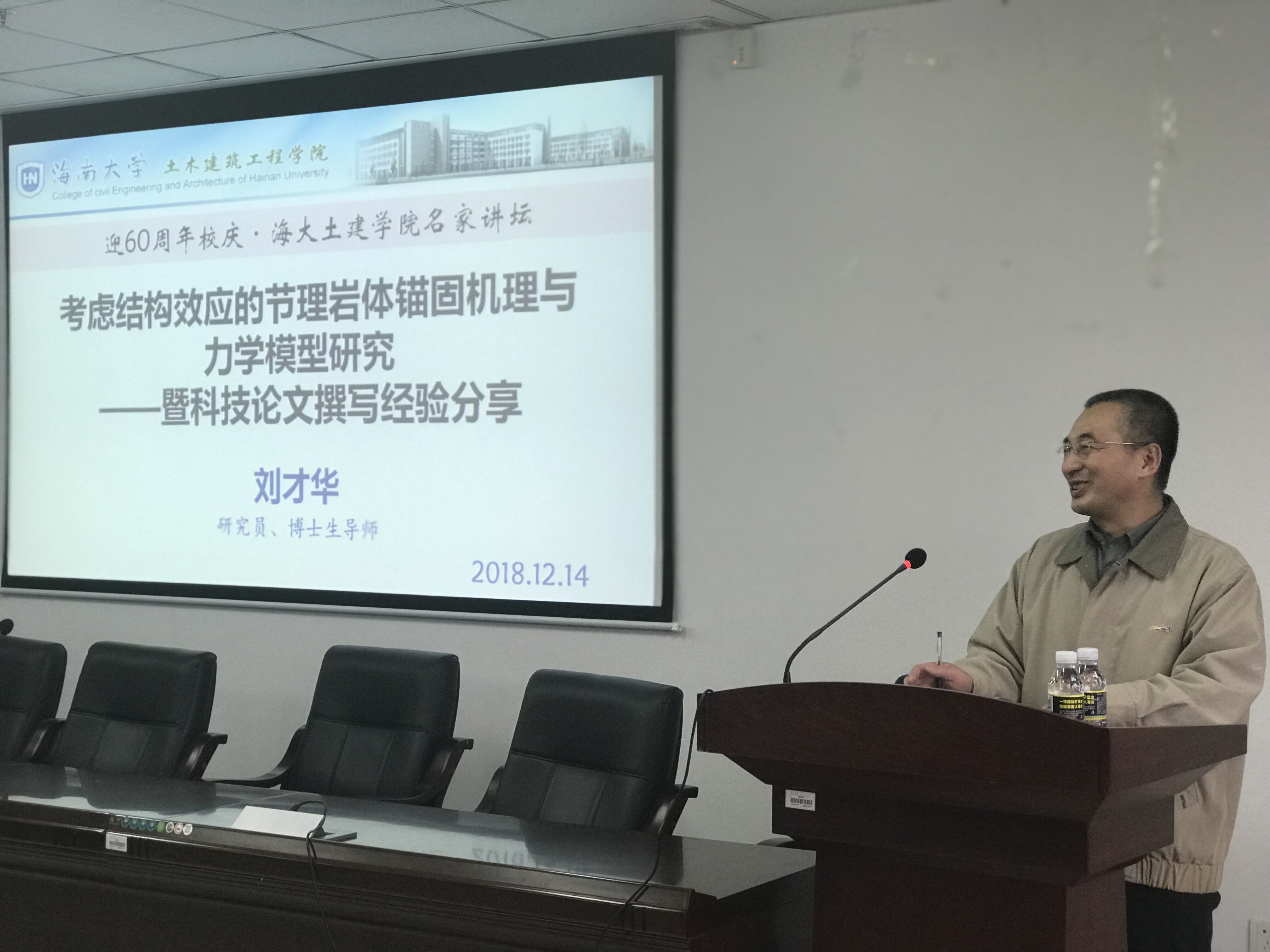 2018年12月14日下午3点,值yl6809永利检测中心迎60周年校庆之际,我院邀请中国科学院武汉岩土力学研究所刘才华研究员为我院师生作学术报告,报告题目为《考虑结构效应的节理岩体锚固机理与力学模型研究——暨学术论文撰写经验分享》。讲座由学院院长曹宝珠教授主持,学院张友良教授、岩土工程教研室全体教师、全体研究生及部分保研本科生参加了本次学术活动。