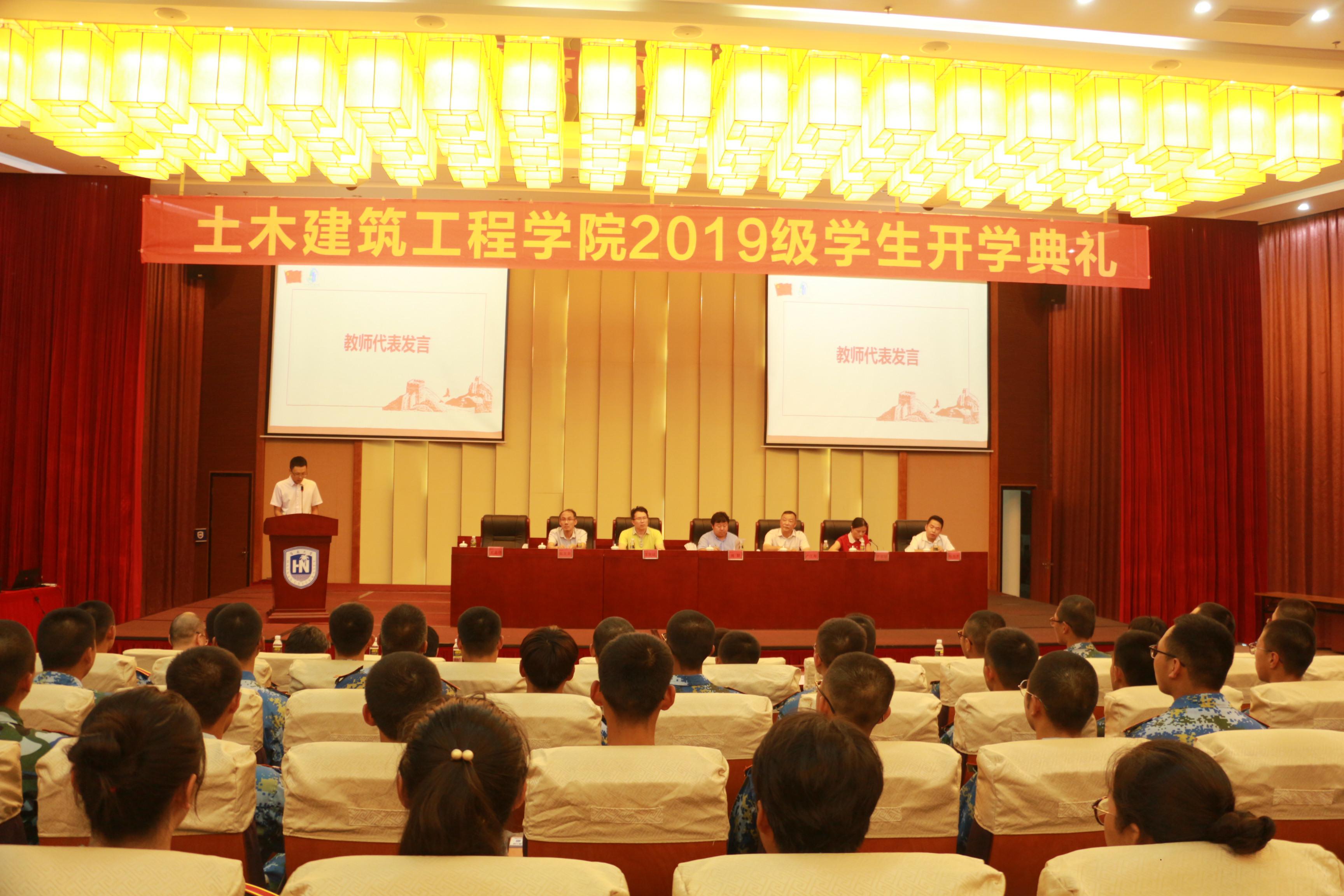 9月12日下午3点,yl6809永利集团在社科楼二楼报告厅举办2019级新生开学典礼。yl6809永利集团院长周智、学院党委卢江海书记、副院长邱宙廷、副院长张友良、土木工程系副主任王志佳老师、学院优秀校友现任中国建筑第二工程局有限公司海南分公司党委副书记的陈丕杰、19级新生班主任应邀参加了开学典礼。学工办主任李江俊老师、詹达夫老师、2019级辅导员牛玉老师以及来自全国各地的2019级的353名本科新生和20名研究生新生参加了开学典礼。典礼由学院党委罗邻球副书记主持。