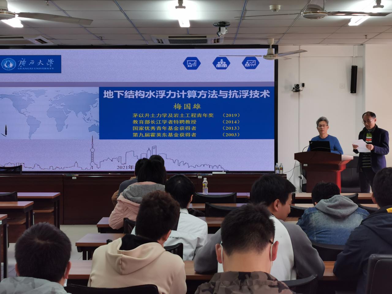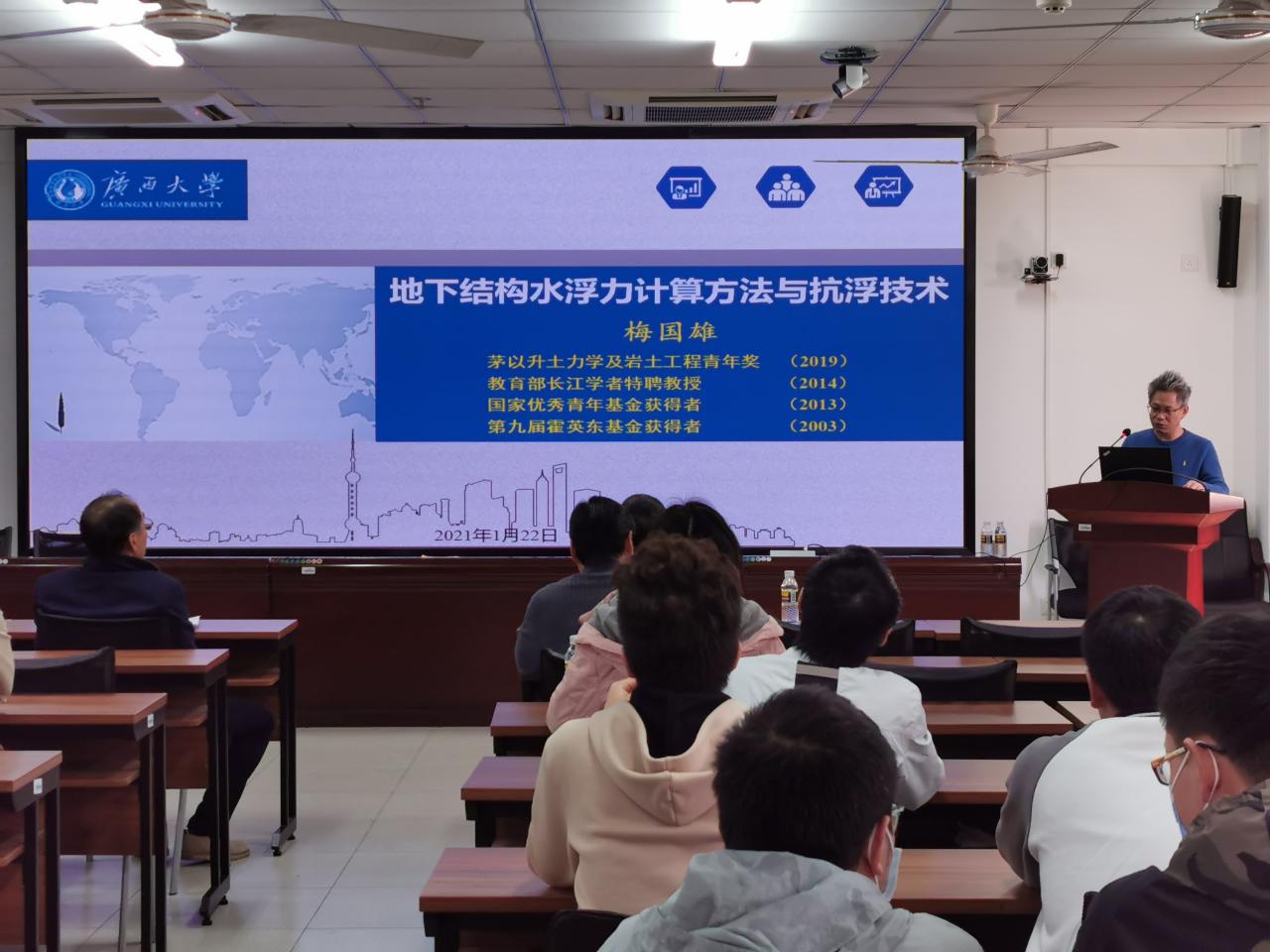 2021年1月22(周五)下午2:00-3:00点广西大学工程防灾与结构安全教育部重点实验室主任梅国雄应我院周智院长的邀请,在yl6809永利检测中心研发楼510报告厅做《地下结构水浮力计算与抗浮关键技术》学术报告。报告会由张友良副院长主持,我院教师和研究生近30人参加了此次学术报告会。