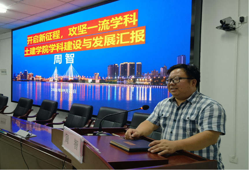 党委委员、学院院长周智教授作《开启新征程,攻坚一流学科——土建学院学科建设与发展汇报》为主题的报告。他重点从形势与使命、发展与现状、挑战与任务、思路与举措四个方面对学院“十三五”期间取得的成绩、“十四五”期间面临的挑战以及应对的思考路径、学院新学期的重点工作进行了阐述。周智强调,在只有土木工程一级学科硕士学位点的基础上,新增了土木工程一级学科博士学位点,新增了“土木水利”专业硕士学位点,并且土木工程本科专业列入国家级一流本科专业建设点,土木工程本科专业认证申报获得评估中心受理。虽然取得了了不起的成绩,但是我们须正确看待,认清使命,成绩特征是给了我们建设机会,而不是成果,现有成绩与“一流学科”差距甚远,同志们须继续发奋努力。我们须继续引进及培养国家级人才和其他各层次人才,充实师资队伍;我们须继续申报争取更多的纵向科研项目和横向项目;我们须继续突破省部级、国家级成果奖项;我们须继续添加省部级、国家级教学和科研平台;我们须以工程教育认证为抓手全力开展金课建设,全面提升创新型人才、应用型人才、国际化人才培养水平。