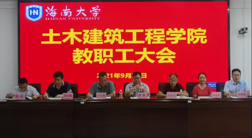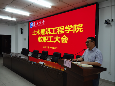 2021年9月23日下午,土木建筑工程学院新学期教职工会议在研发楼510报告厅召开。学院党政领导班子、党委委员、系主任、实验教学中心负责人、支部书记、科室管理职员和全体教师等参加会议。此次会议旨在传达学校暑期工作会议精神,增强学院教师对学校发展状态、战略方向和改革政策的了解,深入理解学院下一步发展方向、路径和举措,进一步凝聚共识、形成合力,为学院“开启新征程、奋进一流学科”开好局、起好步。会议由学院党委书记卢江海主持。