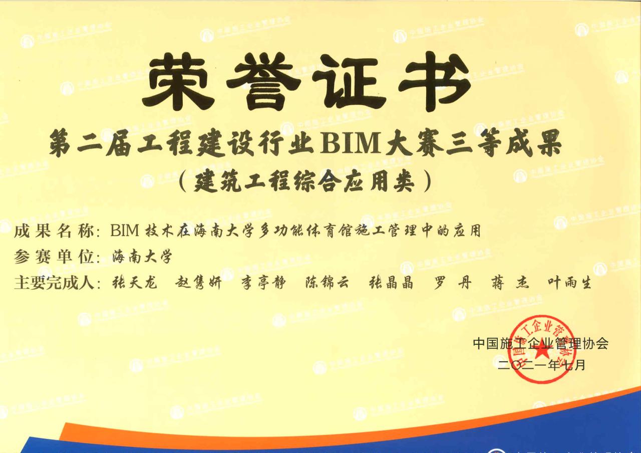 本届大赛组委会设在工业和信息化部人才交流中心,组委会秘书处设在石家庄铁道大学,大赛组委会组建专家委员会,中国工程院杜彦良院士担任专家委员会主任,石家庄铁道大学王明生教授担任秘书长。在赛制上,本届大赛坚持校企联合报名的参赛制度,由院校(高职、本科)和企业联合组成团队参赛。其中由张天龙老师指导、yl6809永利检测中心BIM协会申报的“yl6809永利检测中心多功能综合体育馆BIM技术综合应用”经过网上报名、作品提交、初评、答辩评审等环节,最终再次蝉联金奖!截止到目前,本项目已经荣获2021年全国高校BIM毕业设计大赛二等奖、2021年工程建设行业BIM大赛三等奖和2021年“龙图杯”全国BIM(建筑信息模型)大赛优秀奖。