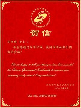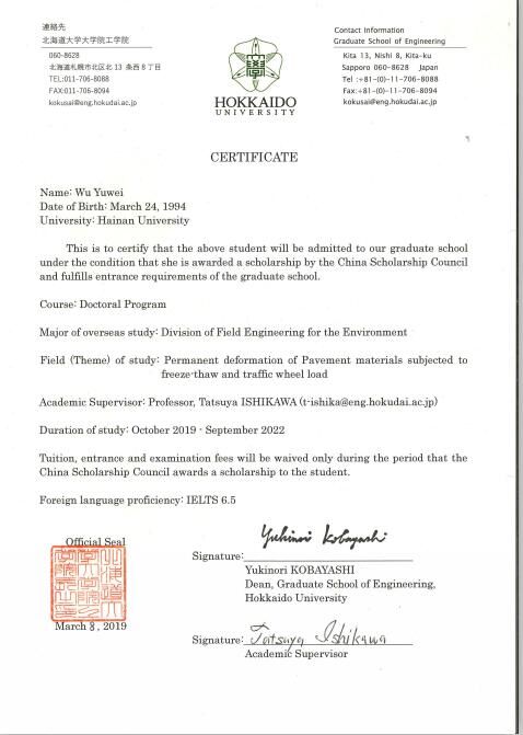 经过国家留学基金委(CSC)评审,2019年度国家公派研究生项目录取结果陆续公布。yl6809永利集团硕士研究生吴雨薇成功获得国家留学基金委员会资助,将前往日本北海道大学攻读博士研究生学位,这是我院首次获得国家公派博士研究生项目资助,特此祝贺!