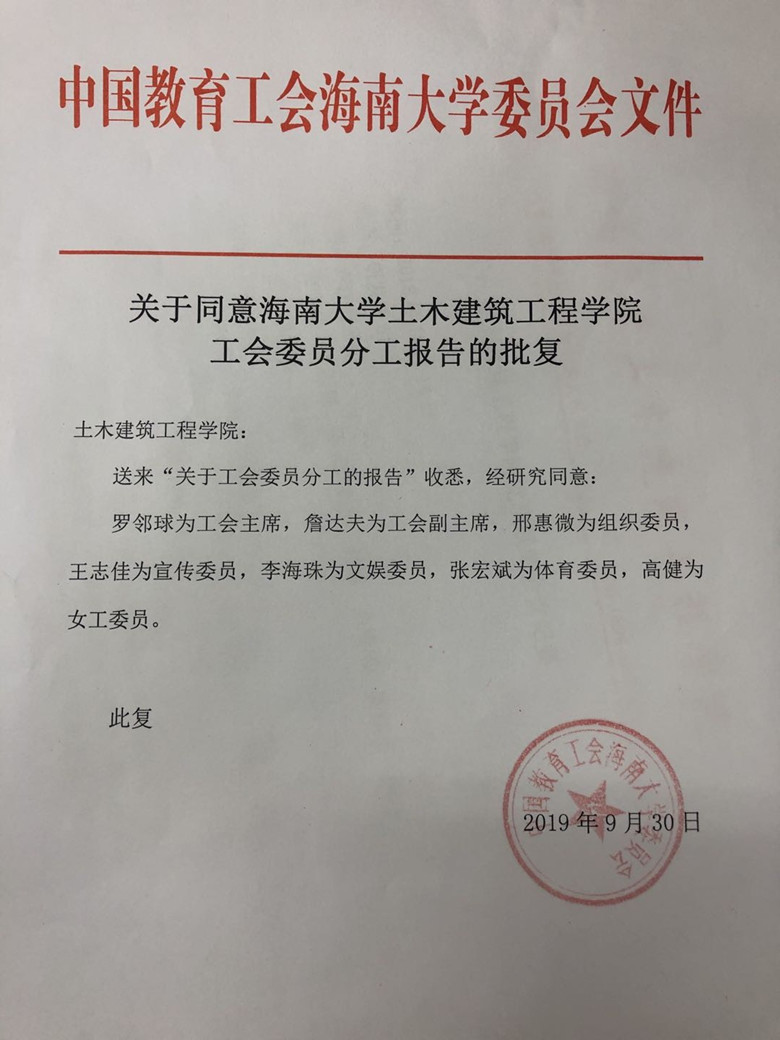 中国教育工会yl6809永利检测中心委员会关于yl6809永利集团工会委员分工的批复