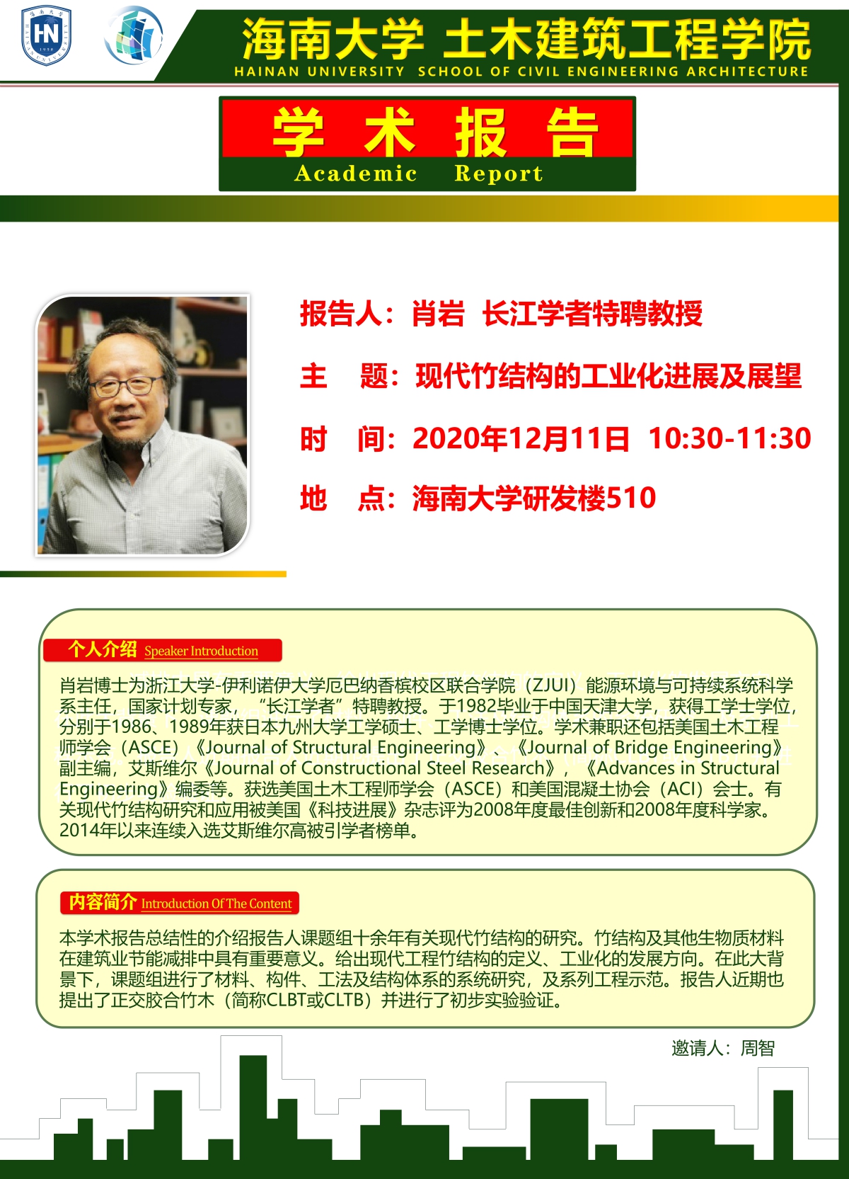 1211日(星期五)上午10:30-11:30点,肖岩教授在研发楼510室,做现代竹结构的工业化进展及展望学术报告,请当天上午没有课的研究生必须参加学术报告会,同时欢迎感兴趣的本科生和研究方向相关的老师参加。