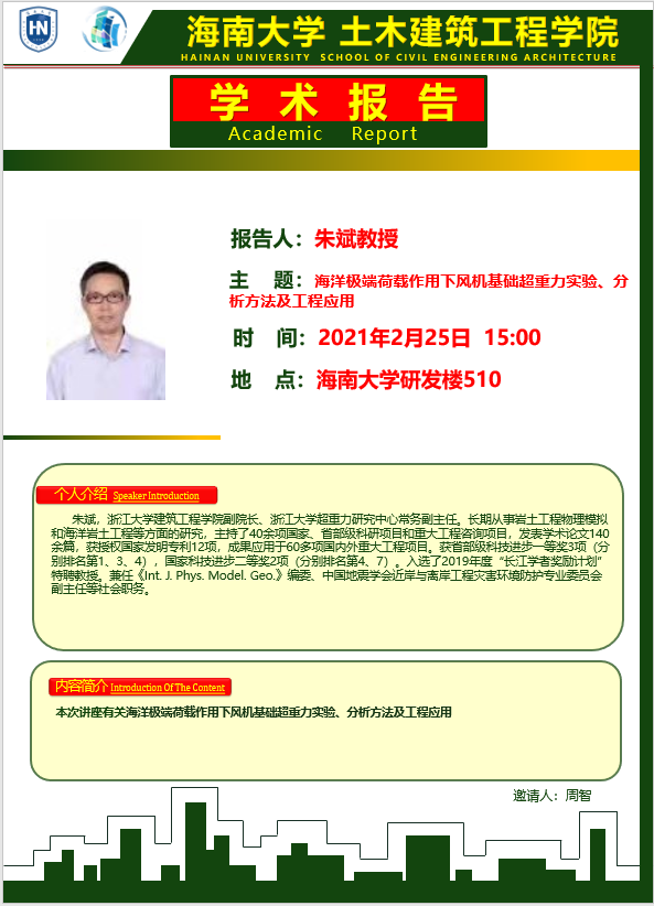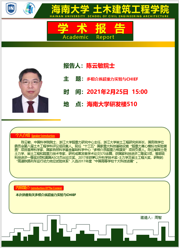 2月25日(周四)下午3:00点在yl6809永利检测中心研发楼510,浙江大学陈云敏院士和朱斌教授分别在我院做《多相介质超重力实验与CHIEF》和《海洋极端荷载作用下风机基础超重力实验、分析方法及工程应用》学术报告。请各位老师和在校研究生务必参加,到时会做参会签名,考勤记录。