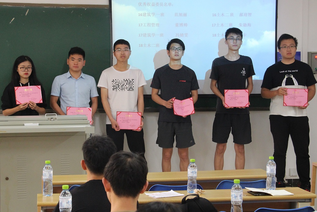 首先,罗成秀以“卖年糕”等维权事件为例介绍权益自律部在过去的半个学期的具体工作及主要维权成果。之后,权益自律部分别向16级建筑学范旭丽、16级土木二班郝迎智、17级工程管理董博帅、17建筑学一班冯靖雯、17级土木二班朱勋海、18级土木一班卞卡、18级土木二班曹乾七位权益委员颁发优秀权益委员证书。大会中,17级董博帅同学为大家分享了他大一时作为权益自律部干事时处理一位学姐在图书馆一楼复习受到中日友好交流中心附近噪音影响后与工作人员发生冲突的事件时遇到的困难,后来他灵活的运用权益知识,事情得到圆满的解决;他提到权益委员要积极配合权益自律部的工作,努力维护学院里同学们的合法权益。大会最后,罗成秀总结了权益自律部在上半年独立完成的和与yl6809永利检测中心学生会合作完成的维权事件。罗成秀提到还存在细节维权事件较少,与学院的同学不能及时沟通之类的问题,需要权益委员们和权益部门的共同努力,争取早日解决。