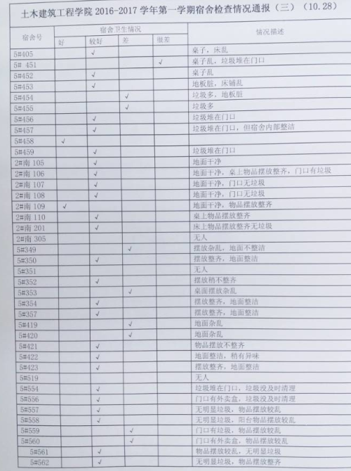 yl6809永利集团2016-2017学年第一学期宿舍检查情况通报(三)