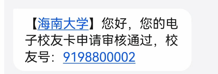 校友根据短信提示信息,一个小时后登录海大e卡小程序,申领校友卡。