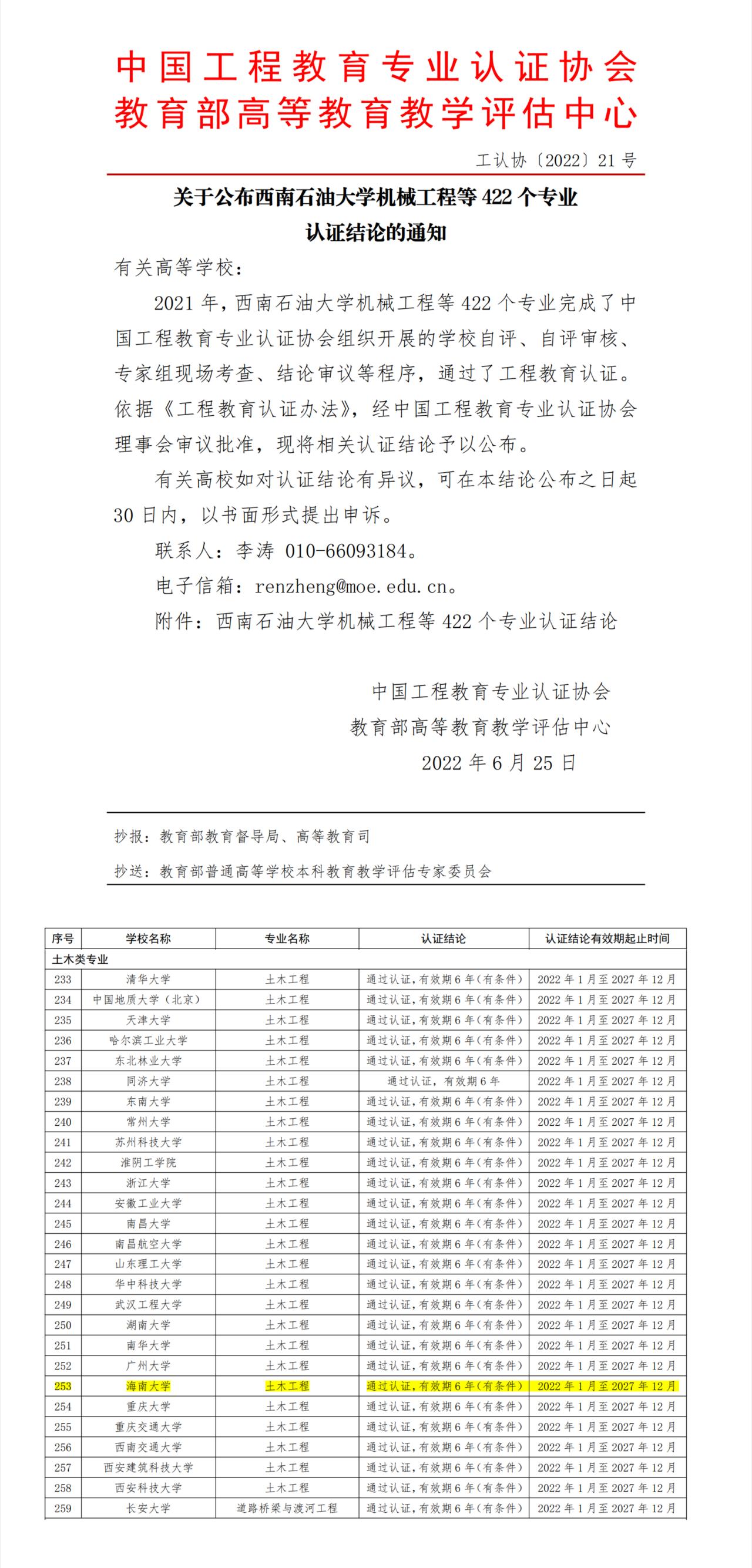 2022年6月25日,中国工程教育专业认证协会、教育部高等永利集团评估中心发布《关于公布西南石油大学机械工程等422个专业认证结论的通知》(工认协[2022]21号)。yl6809永利检测中心土木工程专业顺利通过工程教育认证,认证结论为“通过认证,有效期6年(有条件)”,认证结论有效期起止时间为2022年1月至2027年12月。同时通过认证的有清华大学、同济大学和浙江大学等26所高校的土木工程专业。据悉,该名单还将提交至国际工程教育《华盛顿协议》组织。