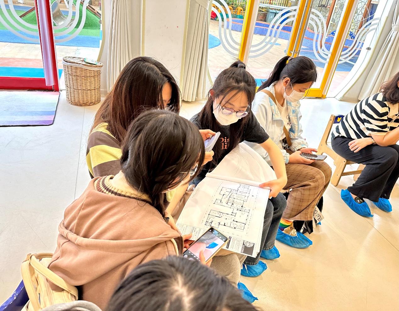 参观开始前,芬奇郡幼儿园管理层作为接待团队,向建筑系师生们详细介绍了园舍空间的功能布局,并着重讲解了幼儿从晨间入园到下午离园的一日活动作息,以及相应的教师和行政、后勤工作人员的工作内容。接着,在老师的带领下,师生一行参观了幼儿园的室外活动场地、多功能厅、公共活动空间、幼儿活动单元,以及教师餐厅和厨房等行政后勤空间。学生们在参观过程中认真拍照、测量、记录,了解幼儿与成年人的尺度差异和心理行为特点。最后,建筑系师生与幼儿园教师们围坐在充满童趣的多功能厅中,进行更深入的交流,把幼儿园实际日常运转与国家规范和文献资料中的理论知识相结合,加深了学生对幼儿活动和幼教工作空间场所的认知和理解。
